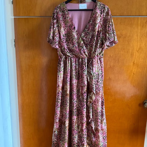 Kjolen er i mykt stoff av bomull og polyester, er uten armer og er flatterende, kan også passe gravide. Er stor i størrelsen, kan også passe størrelse stor, L 40-42.