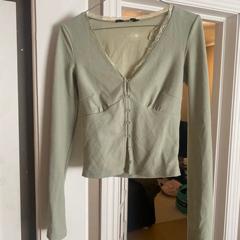 Utringet bluse / topp selges i militær grønn farge. Knappene kan knappes opp og igjen avhengig av hvor åpent man ønsker det i front. Passer fint en størrelse XS og S. God stretch i toppen.