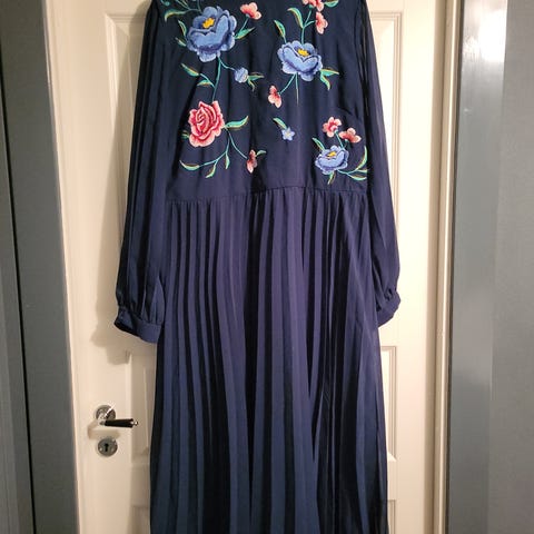 Klassisk brukt blå kjole med en liten kappe nederst, med bluse som tilhører kjolen. Str 12 som tilsvarer str 40. Pris kr 500,-