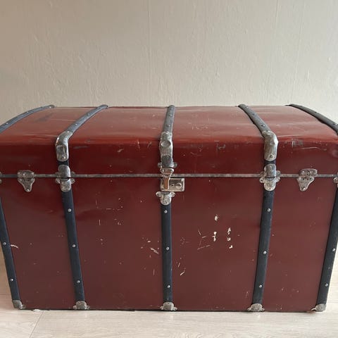 antikvitet, amerikakoffert, reise kiste, vintage, trunk, travel trunk, antique chest, 1800-talls, historisk, retro, industriell stil, industrial decor, sjømannskiste, emigrantkiste, dekorasjon, oppbevaring, vintage decor, collectible, Christiania, Oslo, Johs Christiansen