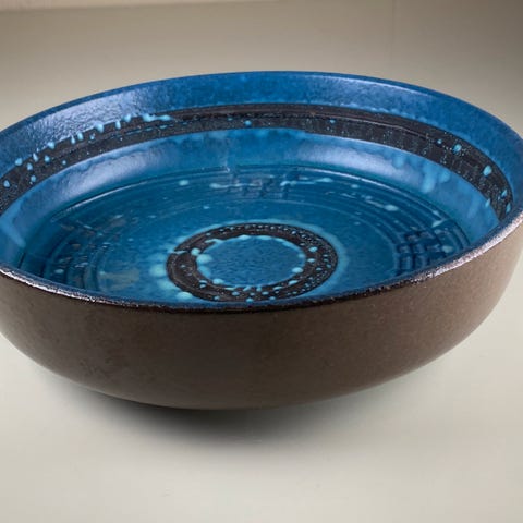 Waechtersbach er kjent for sin produksjon av fargerik og kunstnerisk keramikk, spesielt fra 1950- til 1970-tallet. Produsenten har laget alt fra hverdagsservise til mer dekorative samleobjekter, og de er høyt verdsatt blant samlere av mid-century modern design. Logoen og stemplingen på baksiden bekrefter autentisiteten til dette stykket, som er produsert i Vest-Tyskland i denne perioden.