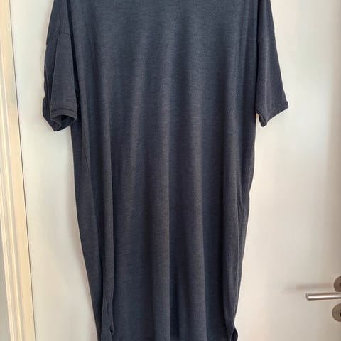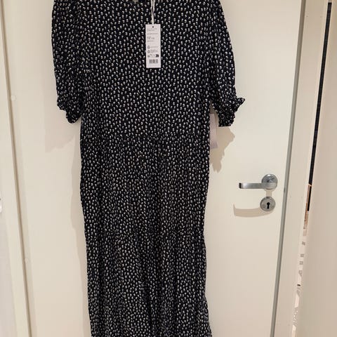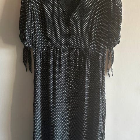 Stilig, men komfy hverdagskjole. Lavt liv og skjørtelengde til midt på leggen. Str S, men kan også passe M og L pga løs passform. Stoffet (viskose) faller pent.