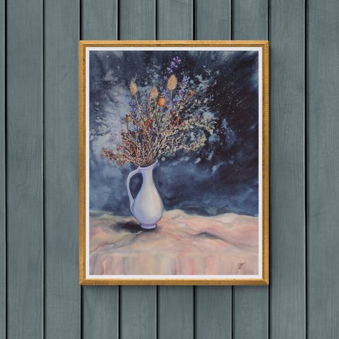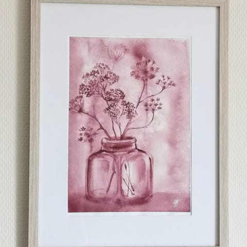 Nøkkelord: original, akvarell, veggkunst, maleri, markblomster, jordfarger, tørkede, planter, vase, billedkunst, stilleben, drøm, hus, rom, hytta