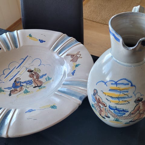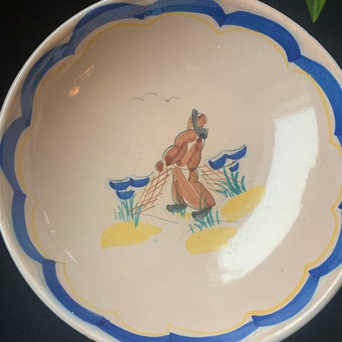 Stort, dypt keramikkfat fra Graveren, Sandnes, med den klassiske, håndmalte dekoren med to fiskere av Elsa Grimsrud.