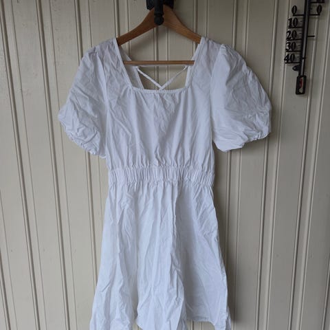 Denne nydelige hvite kjolen har delikate blomsterbroderier i hvitt som gir et feminint og romantisk uttrykk. Kjolen har elegante ballongermer og en åpen rygg med knyting, noe som tilfører et unikt og sofistikert preg. Laget i myk og behagelig bomull, passer den perfekt til sommerens anledninger. Str. S.