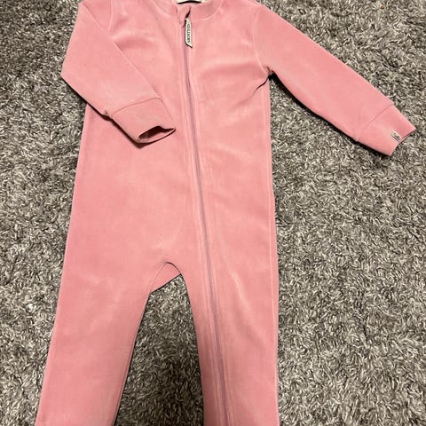 Nydelig sparkedress i velur i dus rosa fra det spanske merket Absorbia. Det står størrelse 59/3 måneder, men erfaringsmessig er Absorbia litt liten i størrelsen. Søt detalj med lommer med sløyfer på foran.