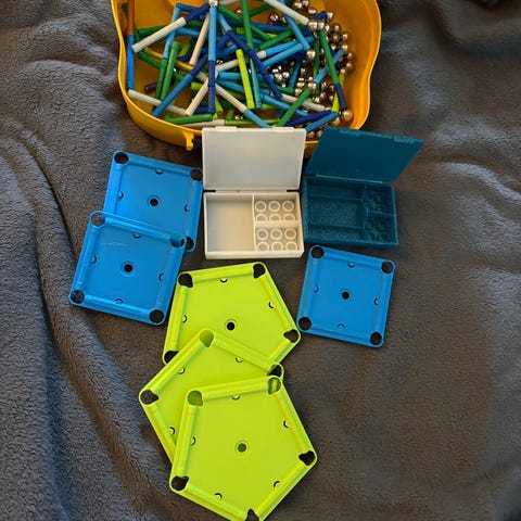 Selger pent brukt kasse med magnetiske kuler og pinner.