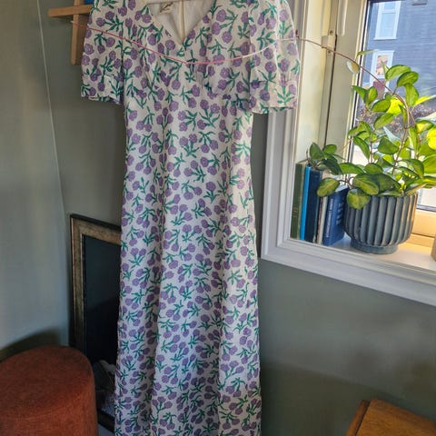 Blomstrete brodert grønn kjole fra det spanske merket Teria Yabar i jacquard mønster. 70% bomull. Prislapp på og ubrukt
