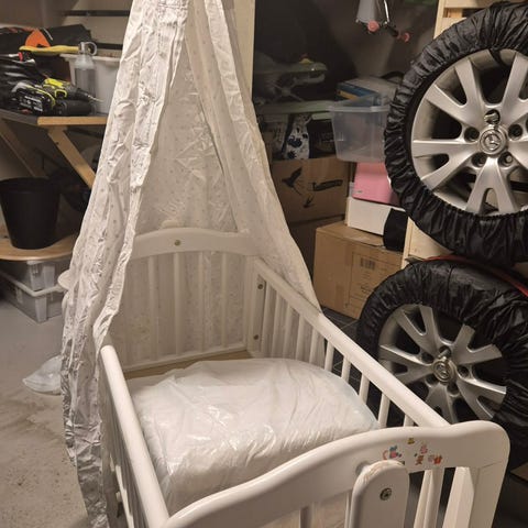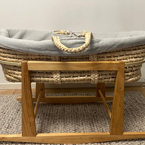 Vanntett madrass i bunn. Den grå liggedelen kan tas av og vuggen er derfor lett å frakte. Trekket kan tas av for vask. Passer fra nyfødt. Må hentes i Tromsø. Nyvasket, både trekk og skumgummi inni. Da en treplate i bunnen også måtte være med i vask ble det hvite innerste trekket noe misfarget under. Har ingenting å si da det grå trekket uansett er rundt