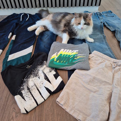 Klespakke i str 140-164. Strikke for å stramme buksa har løsnet på levis buksa, vist på bilde. Levis t-skjorte. 2 gensere fra pompdelux.