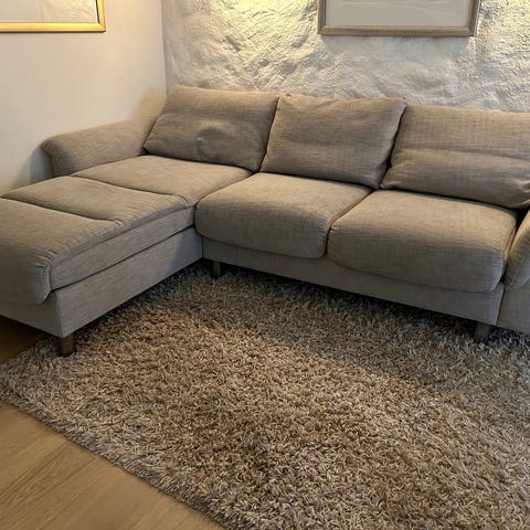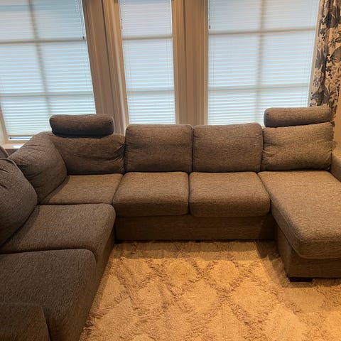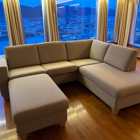 Selges sofa fra Bohus med puff og nakkestøtte. Sofaen kan vendes og sjeselong kan flyttes. Sofaen fremstår som ny, og vil renses før ny eier overtar.