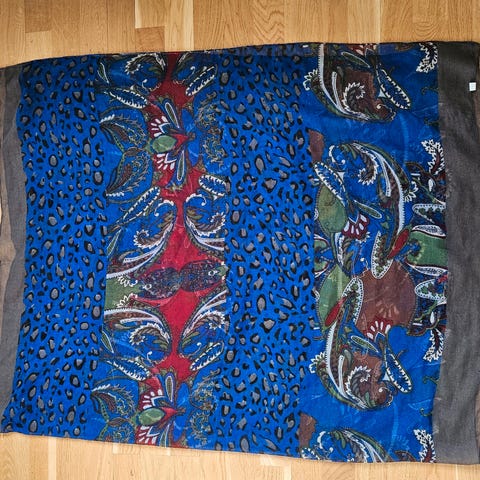 Skjørt : bunnfargen er svart og skjørtet har dekorative farger i blått. Glidelås bak. Hemper til belte. Fint sydde snitt øverst på skjørtet. Str. 44/46. Er fra 1990 tallet.