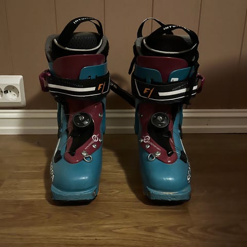Pent brukte sko til randonee fra Scarpa i typen «Dual Density». Str. 279 MM. Bruksmanual medfølger ved salg.
