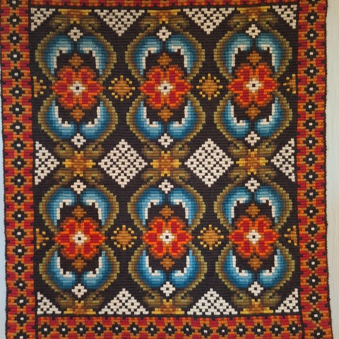 Stort gammelt teppe med smijern i begge ender. 97.5 x 51 cm. Må hentes