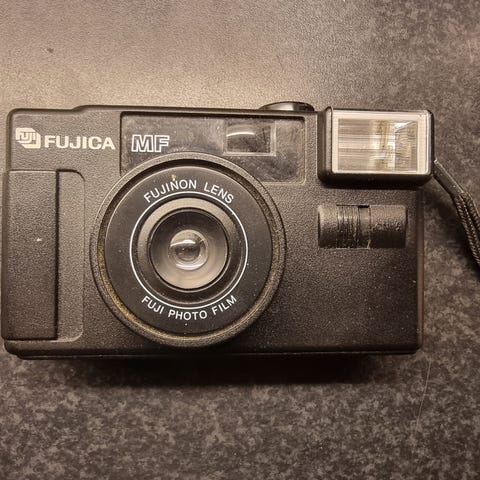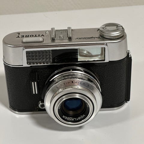Kamera som etter hva jeg forstår ble produsert 1965-69. Ser ut til å være i god stand (knipser og trekkes opp fint). Det følger med veske og en pakke med tre blitzkuber. Det er en liten sprekk i plast på vesken (se bilde).