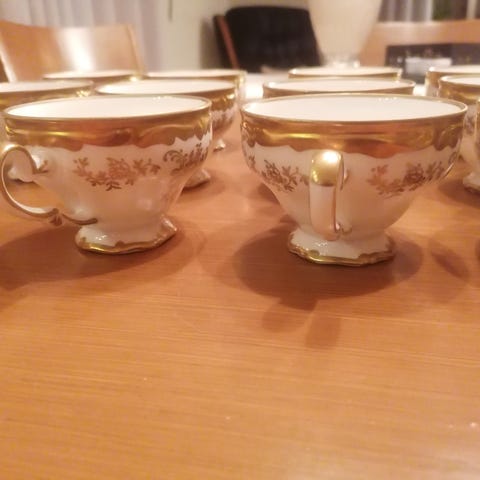 Eksklusiv og elegant kaffeservise til 6 personer, sukkerskål, flotte mugge. Sjelden mulighet å få i sånn stand, ser ut som ny. Ingen feil. Produsert 1933-1945. Hvitglassert porselen. Håndlaget og håndmalt med flott 24 k gulldekor. Skål diameter 13.5 cm., asjett 17.5, kopp høyde 6 cm, diameter 8.2. Kan selges som kurvet ( kopp, skål og asjett) -300 kr.