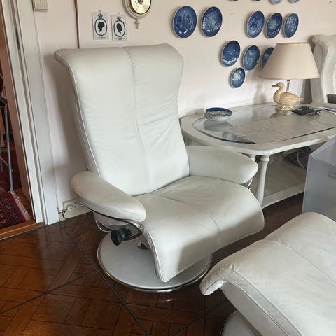 Pen hvilestol i imitert skinn selges. Stolen er i en mørk brun farge med sorte lakkerte ben. Er en del brukt, så har merker på ben etter robotstøvsuger. Fyllet i ryggen har også blitt litt flatt, så man kan kjenne den ene stålstanga.