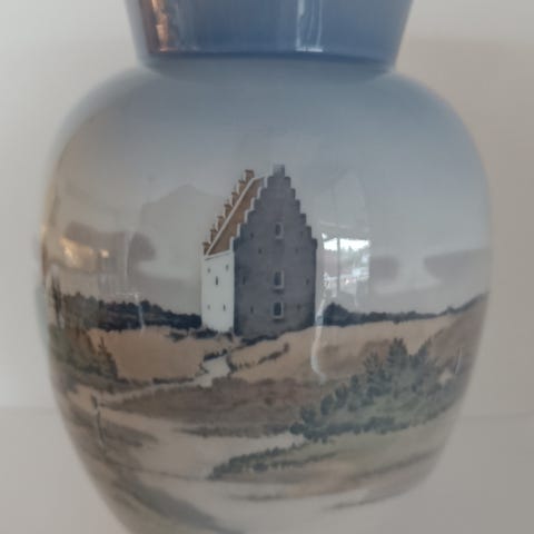 Kronborg slott. vintage. Royal Copenhagen Porselen. 4571. vase. samleobjekt. signert. håndmalt. slott. maritim. båt. Denmark. danmark. kongelig dansk. kongelig dansk porselen. modell 4571. Lyseblå. Vintage.