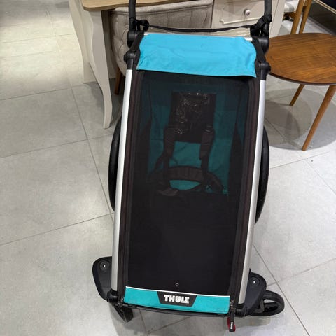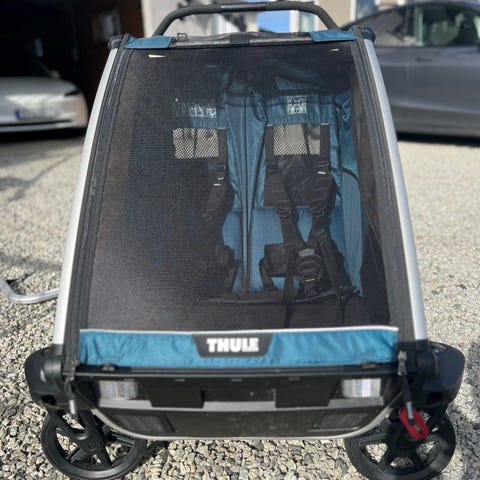 Pent brukt sykkelvogn fra Thule. 5-punkts feste til ett barn. Kommer med stroller kit. Utstyr til løping og ski, samt diverse seler til baby/småbarn, kan kjøpes separat.