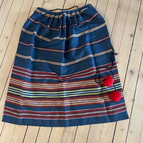 Jeg selger helt nytt forkle til Vestfoldbunad, det har hengt i skapet i flere år, men er aldri brukt. Forkleet er i blå bunnfarge og er 81 cm langt.