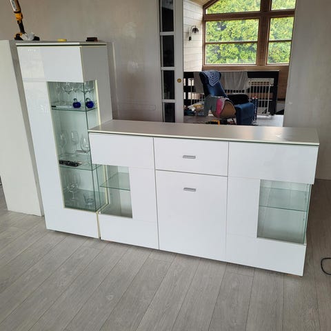 Skjenk i finèr, 210 cm lang med 3 skuffer og 2 skap. 75 cm høy og 42 cm dyp. 6 stålben.