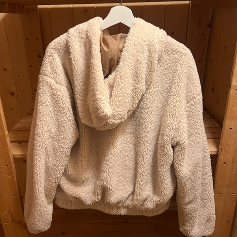 Hvit dongerijakke i str L selges, to brystlommer og to vanlige lommer.