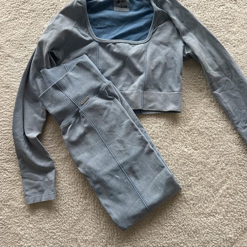 Bukse og topp fra Bik Bok i henholdsvis str 34 og Xs selges kr 250,- Buksen er grå og toppen med lange armer er blå/grå. Se bilder. Sendes mot porto.