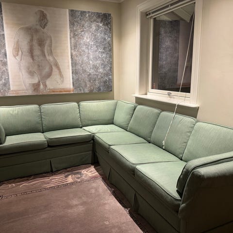 Sofa 220cm lang, 100 cm bredde, sittedybde 64 cm.