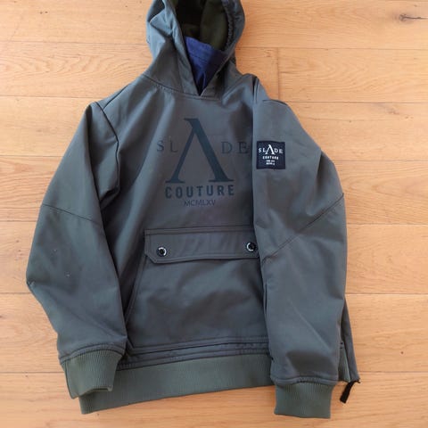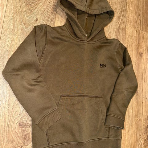 Hette + lomme foran og på armen. Myk og god genser.