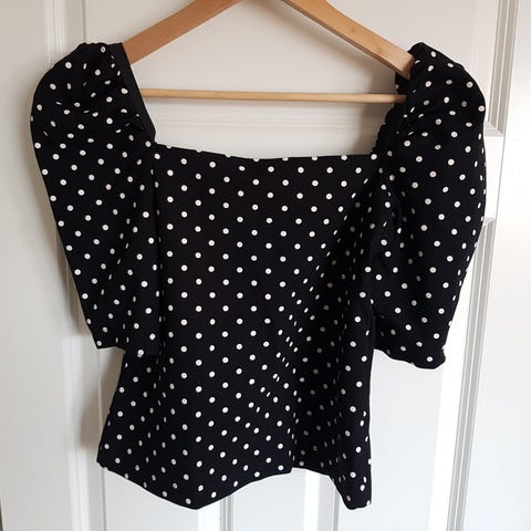 Stilig svart & hvit t-skjorte bluse i lett polyester fra «Only» i str. 40. Fine detaljer som glidelås bak i nakken og avrundede splitter i sidene. Pent/lite brukt og fremstår svært fin.