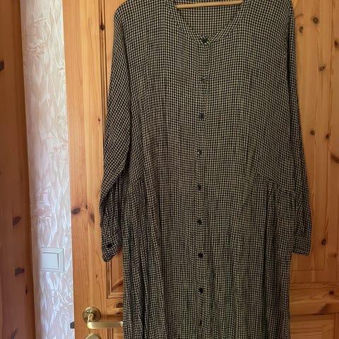 Den sorte kjolen uten armer er xxl. Dette stemmer ikke. Lengde 131 cm. Brystvidde 51 cm x 2. Åpning arm 28 cm. Kjolen er en rett tettsittende modell. Kjolen er elastisk. Kr. 350,-.