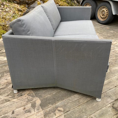 To seters utesofa i plastrotting selges. Vannavstøtende stoff på putene. 1-2 cm høydeforskjell mellom modulene. Ikke merkbart med puter i. Kan deles opp og settes sammen etter ønske.
