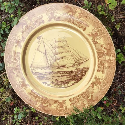 søkeord: minnetallerken tallerken tallerkner tallerkener beige brun båt seilbåt boat plate kjøkken kjøkkenutstyr seilskutetallerkener vintage retro i serien seilskuter Figgjo og Stavanger Flint samler samle samleobjekt samlerobjekt Restauration Lancing vegg