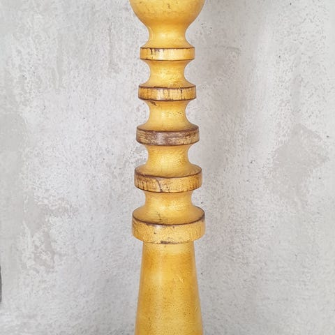 Dette er en fargerik lysestake i tre med håndmalte detaljer i grønt, rosa, gult og blått. Lysestaken har en unik design med flere utskårne ornamenter og en solid base. Perfekt som et dekorativt element i hjemmet for å tilføre litt ekstra farge og karakter til interiøret. Se bilder for mål. 🌺