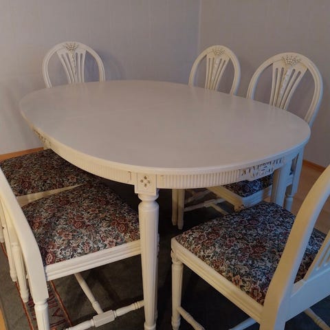 Eksklusivt og komplett sett med et bord og fire stoler. Synlig treverk har nylig blitt slipt og lakkert, setebunnene strammet opp og setene trukket om med dekorativt møbelstoff.
