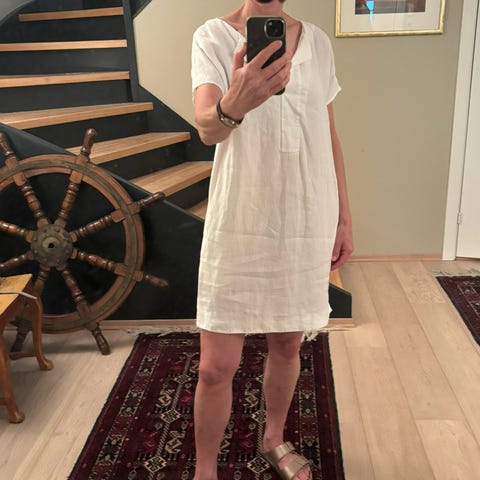 Lekker kjole, foret. Glidelås i siden. Hel lengde 94 cm. Mål under armhulen50x2, livvidde 45x2