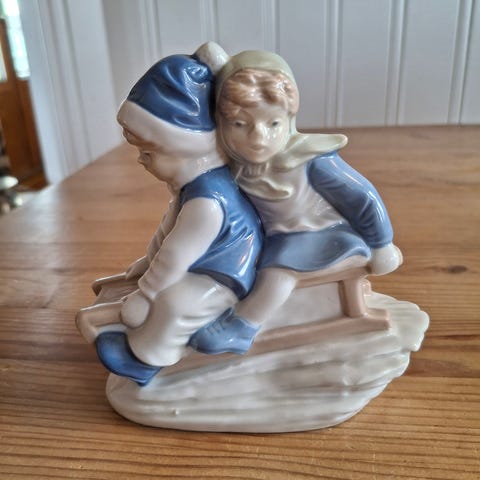 Eldere porselensstatue av en gutte- og jente som aker, tilsynelatende av en tysker kalt Carl Schneider. Produsert på 1950- eller begynnelsen av 60-tallet. Denne tysklagde figuren viser utsøkt håndverk og tidløs sjarm, fantastiske detaljer og en kul skinnende finish. Selges i utmerket vintage stand.