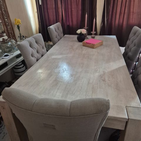 Fint kjøkkenbord. Lengde 180 cm. Runde i kantene så har vært veldig praktisk mtp barn som springer rundt.