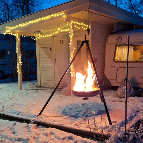 Vannbåren varme og airkondisjen i vognen. Spikerteltet har også en god størrelse på veranda og uteplass.