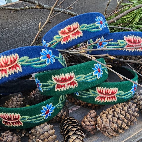 Hårbøyle til Nordlandsbunad i Grønn jeg har i blå også. Stoff og garn kjøpt på husflid i Sortland