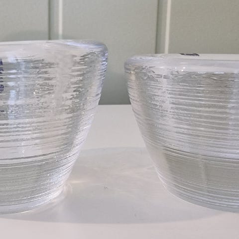 Disse vakre lysestakene er tunge og massive, hver av dem veier 500 g. Høyde ca 11 cm, diameter ene siden 6,7 cm og diameter andre siden 3,7 cm. De er ikke prikk like, antar derfor at de er munnblåst. Vet ikke hvilket glassverk de kommer fra, men veldig dekorative.