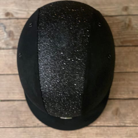 Ridehjelm i mikrofiber med glitterdekorasjon på midten. Fire diskrete ventilasjonshull som bidrar til at du holder en behagelig temperatur gjennom rideøkten. Hakerem og sele i nylon. Godkjent i henhold til PAS 015:2011.
