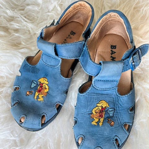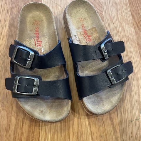 Hel, brukt av ett barn. Kvalitet sandaler av semsket skinn som puster godt og gir god støtte til foten. Kan brukes som innesko, puster godt.