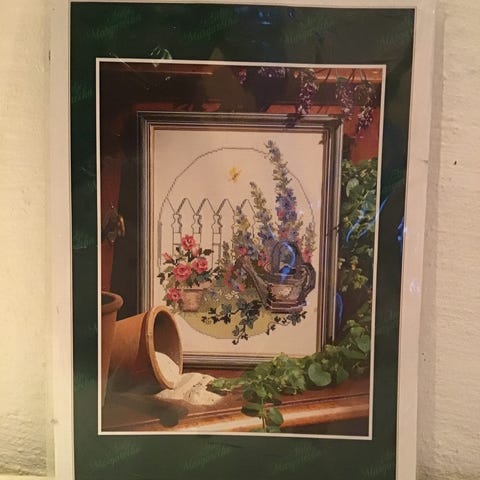 Broderes med moulinégarn i utregnede kors- og attersting på ekryfarget aidavev,