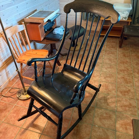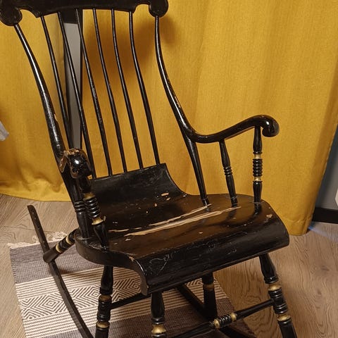 Selger en klassisk, sort gyngestol. Stolen er i god stand, men malingen har skallet av flere steder (se bilder), dette kan lett males over.