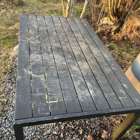 Pent brukt grønt hagebord.H 73 cm Dia 90 cm er av plastikk som beina kan monteres av under lagring.