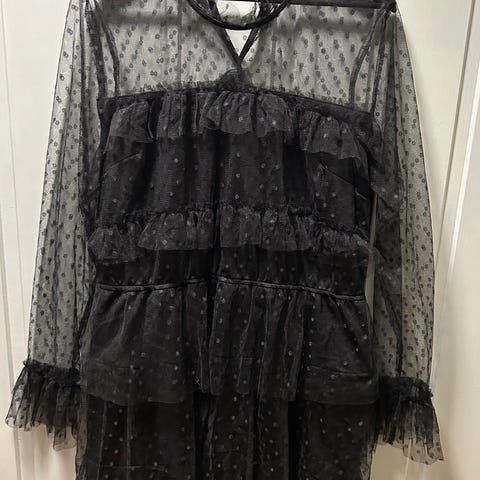 Svart kjole med blomsterdryss i gult. Lange ermer med strikk i mansjetten. Utringet. Se bilder.