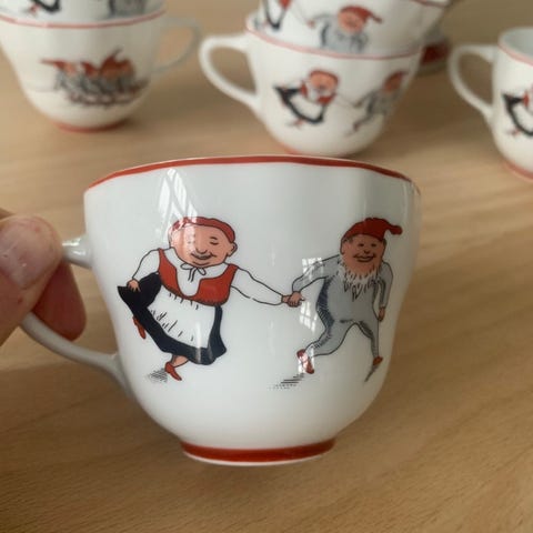 Kopp med underskål fra Porsgrunds Porselænsfabriks stemningsfulle Nisseservise.