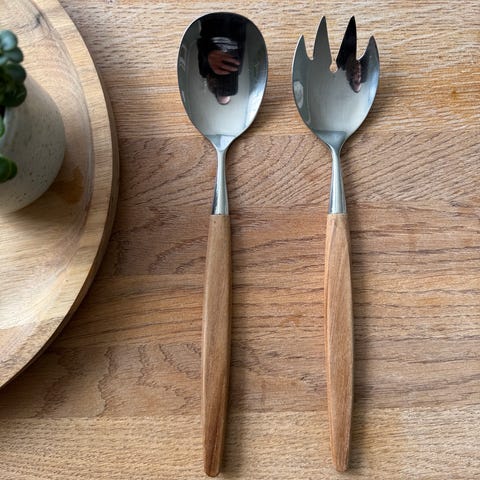 søkeord: Kjøkken kjøkkenutstyr brun bordpynt pynt gaffel skje skål vintage retro selskap serveringsbestikk stål bestikk metall salatredskaper rustikk stil naturlig material salatsett design salatservering dekorativt kjøkkentilbehør matservering stilfullt funksjonelt naturlig servering