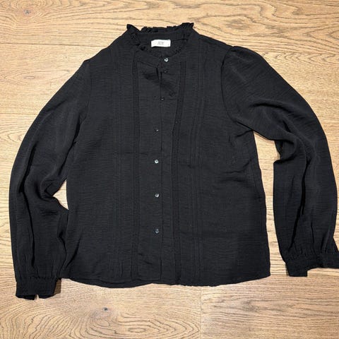 Svart bluse med knytting i halsen. Merke: Vila. Gjennomsiktig med blomsterdetaljer i halsen.